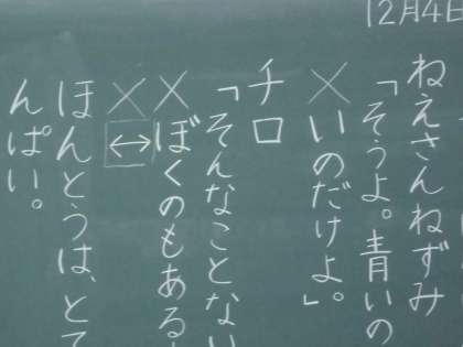 セリフのところをノートに書くときに、「 」の書く位置、「 」の改行の時の位置などについて子供たちに教えていました。