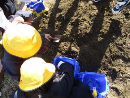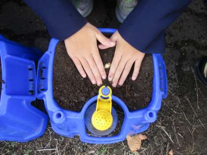 うえきばちに土を入れて球根が見えないように一生懸命植えたよ!!