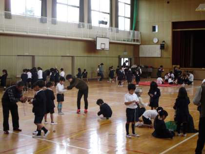 今日は『むかしあそび地域交流会』がありました。13人のゲストティーチャーの方に来て頂き、昔の遊び道具の使い方や上手に遊ぶコツなどを教えて頂きました。