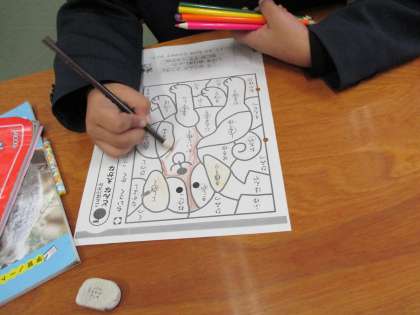 その後、小さい「っ・ゃ・ゅ・ょ」で使う言葉を探して色を塗るという課題です。
