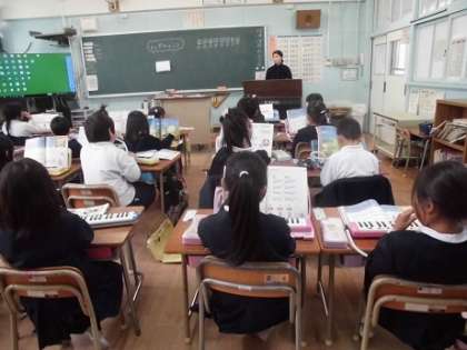 先生のピアノに合わせて鍵盤ハーモニカで演奏です。