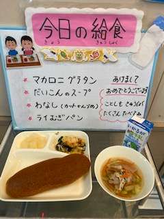 今日から3学期の給食がスタートしました。しっかり食べて風邪に負けない元気な体をつくってほしいです。子ども達はグラタンが大好きです。具だくさんでホワイトソースの味もよく、おいしかったです。