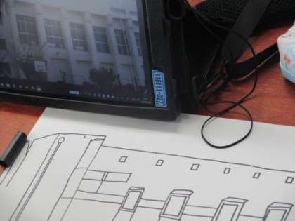 校舎の写真をたくさん撮り、タブレットに移し、