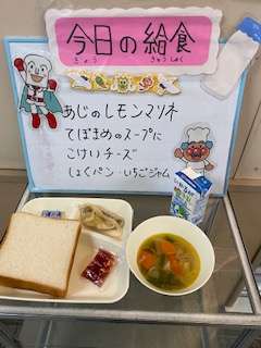 今日の給食は、牛乳 食パン あじのレモンマリネ てぼ豆のスープ煮 固形チーズ いちごジャムです。