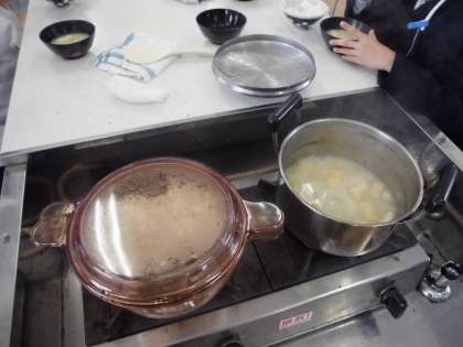 ごはんを鍋で炊き、煮干しでだしをとって味噌汁をつくりました。