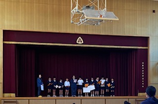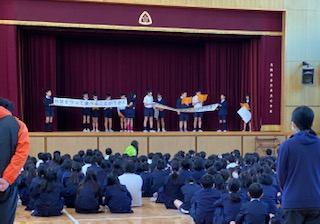 1月30日の児童集会は給食委員会の担当でした。日頃の給食への感謝をつづった手紙を読むのを給食調理員さんに聞いていただいた後、調理員さんにお話をしていただきました。