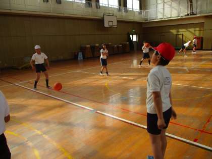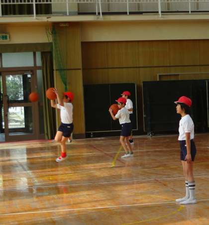 体育は「バスケットボール」をしています。今日は初めてバスケットボールを持ち、パスの練習やポートボールなど簡単なゲームを行いました。少しボールが重そうですが、頑張ってボールを投げていました。