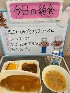 今日の給食は、牛乳 おさつパン コーンスープ 牛肉のデミグラスソース煮 かぼちゃプリンです。