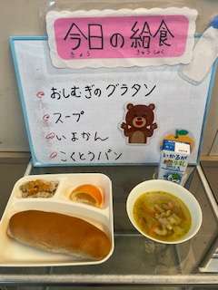 今日の給食は、牛乳 黒糖パン おし麦のグラタン スープ いよかんです。