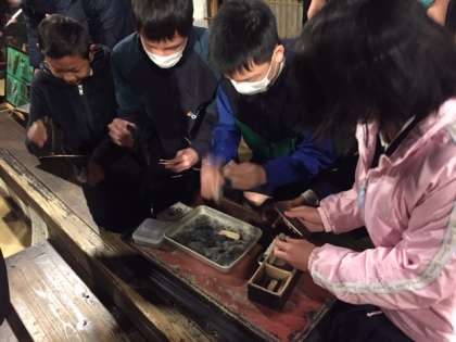 千両箱の実際の重さがどれぐらいのものか、また火打ち石で火をおこすことができるか どうか、体験をしてみました。