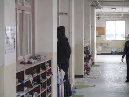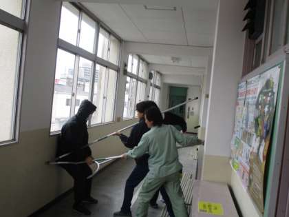 警察の方に実際に不審者役として校内を回ってもらい、先生たちもさすまたをもって訓練を行いました。
