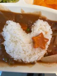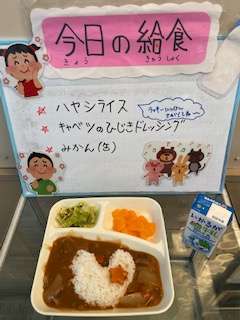 ハヤシライスには星型のラッキーにんじんが入ってました。給食室のこんだての見本は、いつもよりおしゃれに盛りつけてあり、子ども達はわあー、と、うれしそうにのぞきこんでいました。おいしいハヤシライスが、よりおいしそうに見えます。食べてみると、やっぱりおいしかったです。