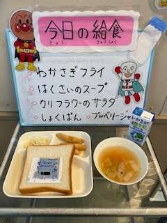 今日の給食は、牛乳 食パン 白菜のスープ わかさぎのフライ カリフラワーのサラダ