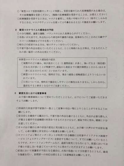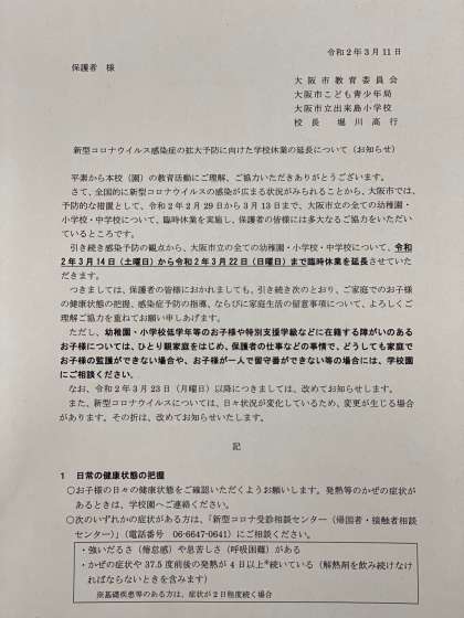 本日、大阪市教育委員会より臨時休業の延長についてお知らせがありました。保護者向けの文書は、こちらからご確認の程をよろしくお願いいたします。