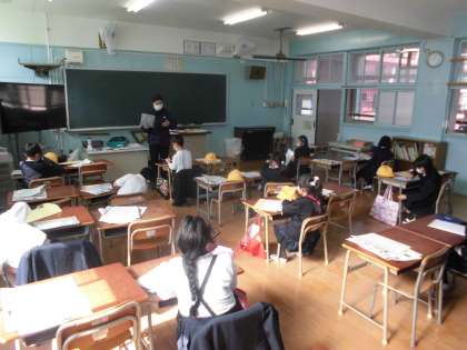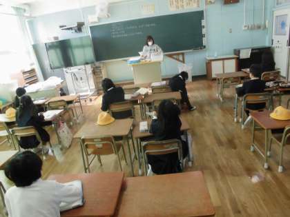 久しぶりの学校への登校ですが、それぞれの学級ともいつもの半分の人数で、持ち帰りの配布物や連絡事項を聞いています。