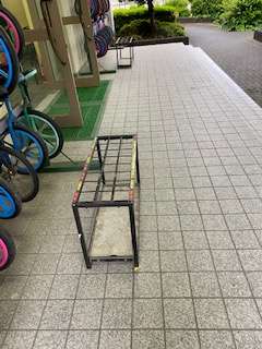 体育館前に傘立てを置いています。名ふだをつけていますので、お子さんと一緒に傘を入れてください。