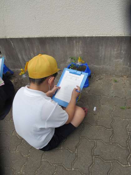 今日は、水やりをして、葉っぱの形や触った感触を観察カードに記録しました。