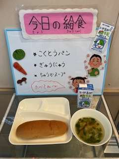 今日の給食は、こくとうパン、牛乳、中華スープです。
