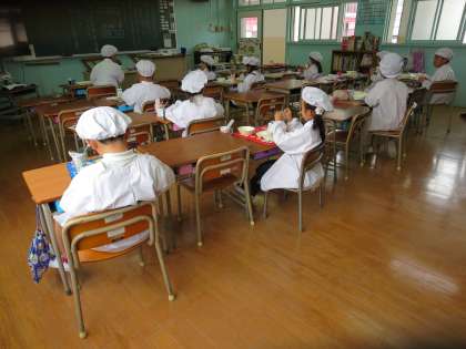 月曜日には、「わー、めっちゃおいしい!!」「おかず、あったかくておいしい!」など感嘆の声が多く聞かれました。グループで机を合わせたり、楽しくおしゃべりしたりはまだできませんが、みんなの笑顔がたくさん見られた有意義な時間でした。