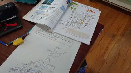川の名前と場所を地図に表したり、山地や山脈が多い日本の地形では、川は山から平野を通って海に向かって流れていくことを学習したりしました。