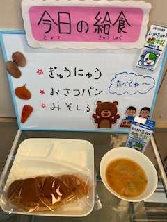 今日の給食は、おさつパン、牛乳、みそしるです。