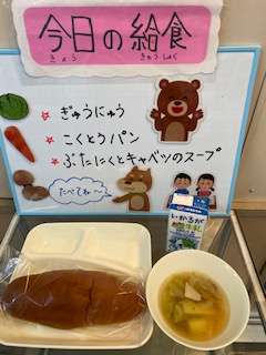今日の給食は、こくとうパン、牛乳、豚肉とキャベツのスープです。
