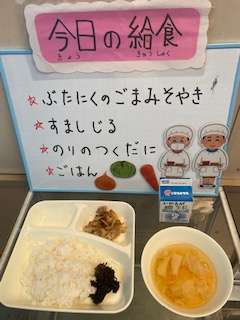 今日の給食は、牛乳、ごはん、豚肉のごまみそやき、すまし汁、 のりのつくだにです。