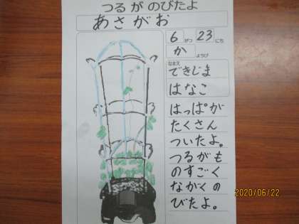明日の宿題で、観察カード「つるがのびたよ」を持ち帰らせますので、伸びたつるや葉の様子を、上の写真のような感じで、絵に描かせてください。