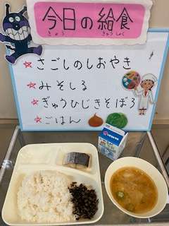 今日の給食は、牛乳、ごはん、みそ汁、ぎゅうひじきそぼろ、さごしの塩焼きです。