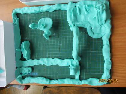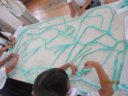 2時間目は、図工室に移動し、グループ4人の粘土をつなぎ合わせて、長い長いひもひもねんどを作りました。