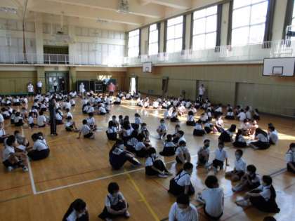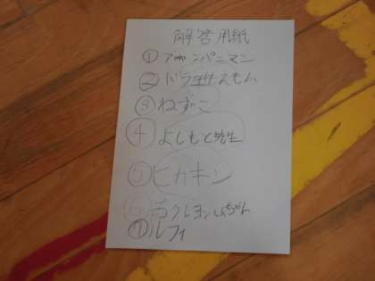 今日の集会はハローグループに分かれて、「わたしはだれでしょう?」というクイズゲームをしました。5年生の集会委員が出すヒントをもとに、ハローグループのみんなで楽しみながらキャラクターや先生の名前を考えました。