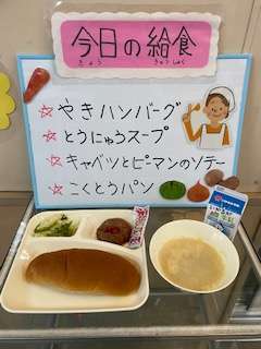 焼きハンバーグは、表面にはほどよい焼き色がついています。豆乳スープは、野菜がたくさん入っていて、豆乳の風味がよくおいしかったです。