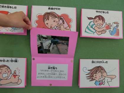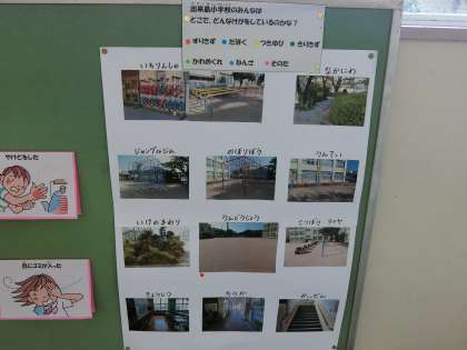 今月の保健目標は「けがをふせごう」です。保健室前の掲示板には、自分でできるけがの手当について掲示をしています。また今月は、学校のどこでどのようなけがをしているのかがわかるように、けがをしたら種類別に色分けしたシールを貼るようにして、子どもたちが安全に過ごせるように啓発していこうと思います。