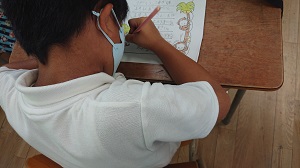 自分が今、学校や習い事などでがんばっていることについて、お手紙を書きました。また、封筒や便箋のまわりをきれいに装飾したりしました。