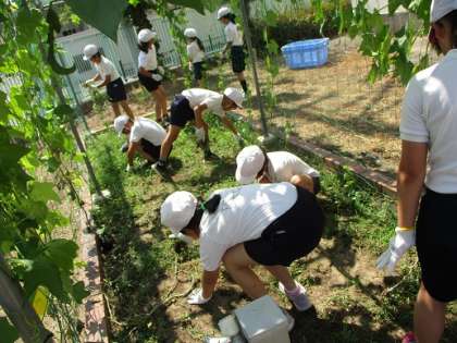 クリンクリンデーを行いました。4年生の掃除場所は学習園でした。理科で育てている『ヘチマ』も見ながら、皆で一生懸命、掃除を行いました。皆が頑張ったことで学習園がとっても綺麗になりました。