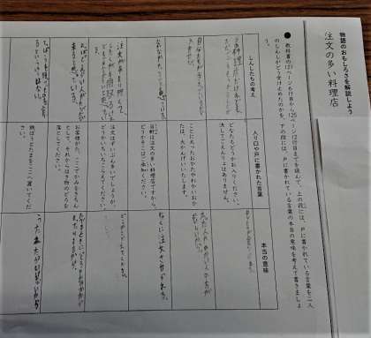 国語科で学習している「注文の多い料理店」の物語では、物語をおもしろくしている表現のくふうがたくさんあります。山奥で見つけた「西洋料理店」を訪れた若い紳士たちは、戸に書かれた言葉を見つけます。戸は次々に見つかり、戸の表や裏に、様々な言葉が書かれています、物語を読み進めると、紳士たちが考えた言葉の意味と、西洋料理店が考えている言葉の意味とは、どうも違うと気づきます。