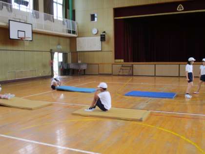 4年生は、マット運動をしています。前転と開脚前転、後転と意欲的に取り組んでいます。