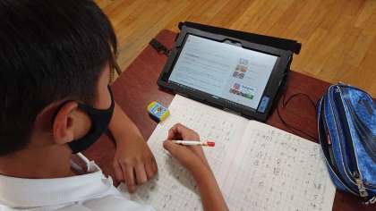 5年生国語科の学習の、「和の文化を受けつぐ」という単元で、和菓子のことを紹介する書き方を学んだ後、自分たち(グループ)で和の文化について調べたいものを選び、担当を決めて調べる学習をしています。「着物」「織物」「和室」「ろうそく」など、調べたいものを考えて、パソコンやタブレットを使って知りたいこと、伝えたいことを調べています。