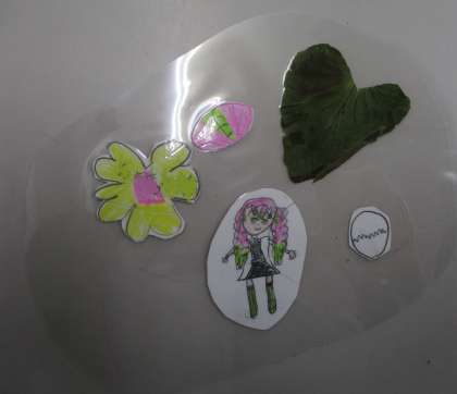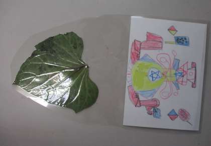 さつまいもの葉を使って、しおりをつくりました。ラミネートも、大きさも自分で考えて工夫しました。世界に1つしかない素敵な作品ができました。