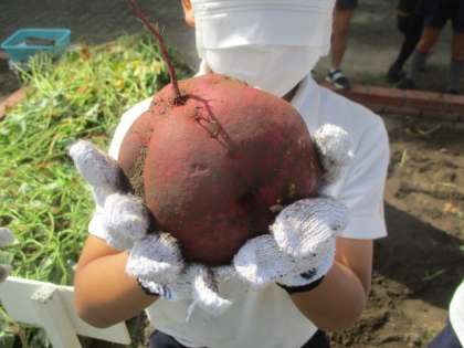 先週は、すっきりしない天気が続き、なかなかできなかったお芋ほりでしたが、みんなでお芋をほることができました。