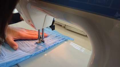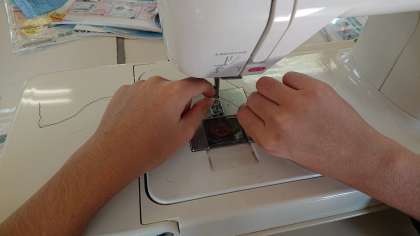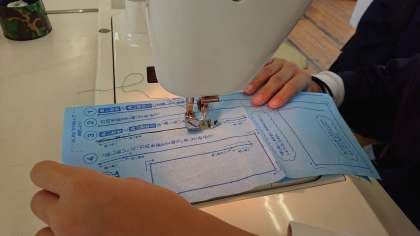 ミシンに糸を通して、練習布で縫う練習をしました。