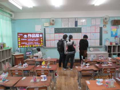 今日は、1年1組の教室で作品展でした。