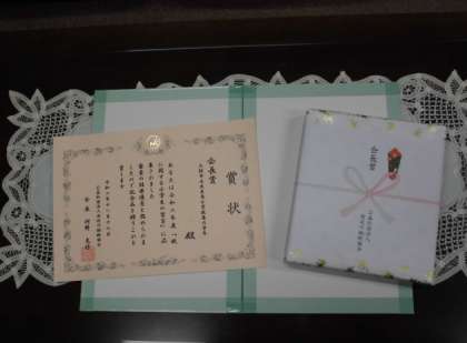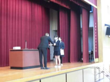 今日の児童朝会は、令和2年度「小学生の税に関する習字」で、6年生2名が納税協会会長賞を受賞した表彰式が行われ、賞状と副賞が贈られました。