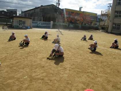 体操座りをしている足の間にボールを入れます。集合して待つ姿勢もバッチリの子どもたちです。
