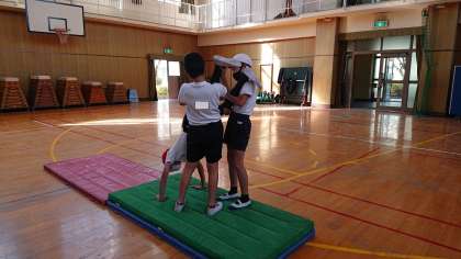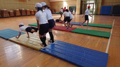 1人1枚のマットを使って柔軟体操をした後、3人グループで倒立の感覚をつかむために、手押し車で進んだり、手押し車よりも少し高い位置に足を上げて、足が高く上がる感覚を練習しました。