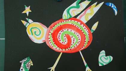 図画工作科では、「カラフルバード」と題した絵画作品を作成しました。