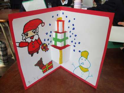 今日はクリスマスでした。生活のときにクリスマスカードを作りました。線に沿って上手に切って、色付けも考えてできました。