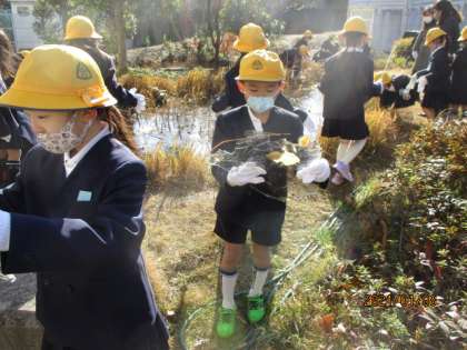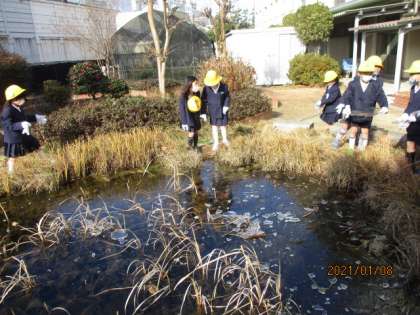 冬の様子を学習するために、運動場や校舎裏にある池の様子を見に行きました。池の水が凍っていて、小石を投げたくらいでは割れませんでした。