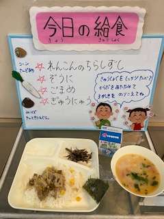 さっそく、給食も始まりました。れんこんのちらし寿司、雑煮、ごまめで、お正月らしいこんだてです。雑煮は、大阪らしく白みそで味付けしていておいしかったです。
