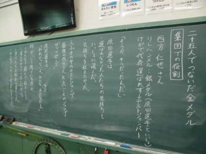 今回の道徳は、「二十五人でつないだ金メダル」でした。